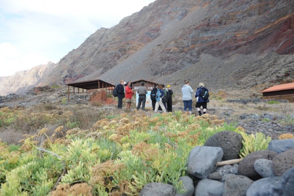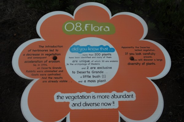 Fleiri upplýsandi skeltir vóru at lesa. Her stendur at lesa, at tað at tey høvdu sloppið geitum og kaninir út á Desertas oynna hevði havt við sær at erosjón, ella jarðslit, øktist í stórum. Síðani hava tey minkað um talið av geitum, og hava tikið kaninirnar av, og hetta hevur hjálpt munandi. Á Desertas eru 2 plantusløg sum einans vaksa har, talan er um ein runn og ein mosa. Mynd: Birgir Sondum